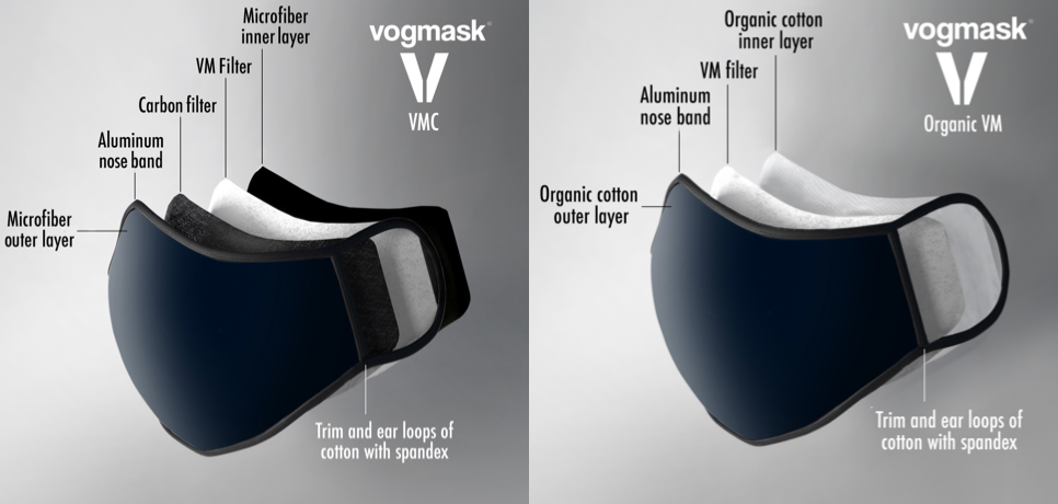 Vogmask VMC and Organic VM are NON VALVED filtering masks. Vogmask VMC is printed outer layer with middle layers of VM particle filter for >98% of microscopic particles and carbon filter and inner layer of woven microfiber. Vogmask Organic VM is certified cotton outer and inner layer with middle layer of VM particle filter for >98% of microscopic particles. The filtering efficiency depends on a good seal around nose and mouth. Non valved Vogmasks filter inflow and outflow.