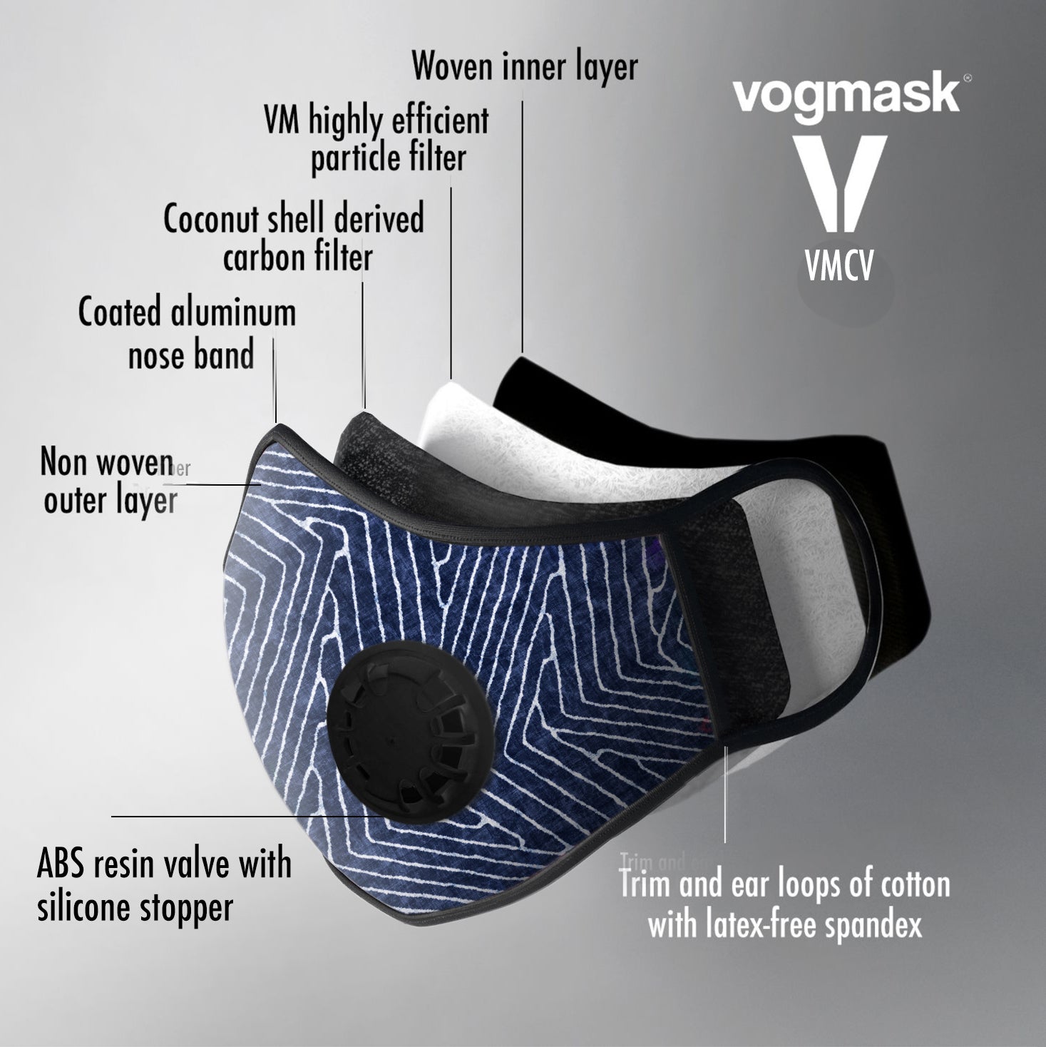 - VMCV FEATURES ~ Superior protection from PM .3 and 2.5 particles in air pollution and other airborne particles of mass mean diameter .3 microns. Exhalation valve facilitates the exit of moisture and CO2 from the interior of the mask. Valved masks protect the wearer of the mask from inhalation of microscopic particles. Aluminum noseband forms to seal gaps on either side of nosebridge. Trim and ear loops are made with cotton and 6% latex-free spandex.